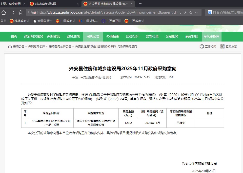 兴安县城市危旧房改造政府大院(一期)项目采购项目的潜在供应商应在广西政府采购云平台线上获取获取采购文件,并于2025年12月17日 09:30(北京时间)前提交响应文件。